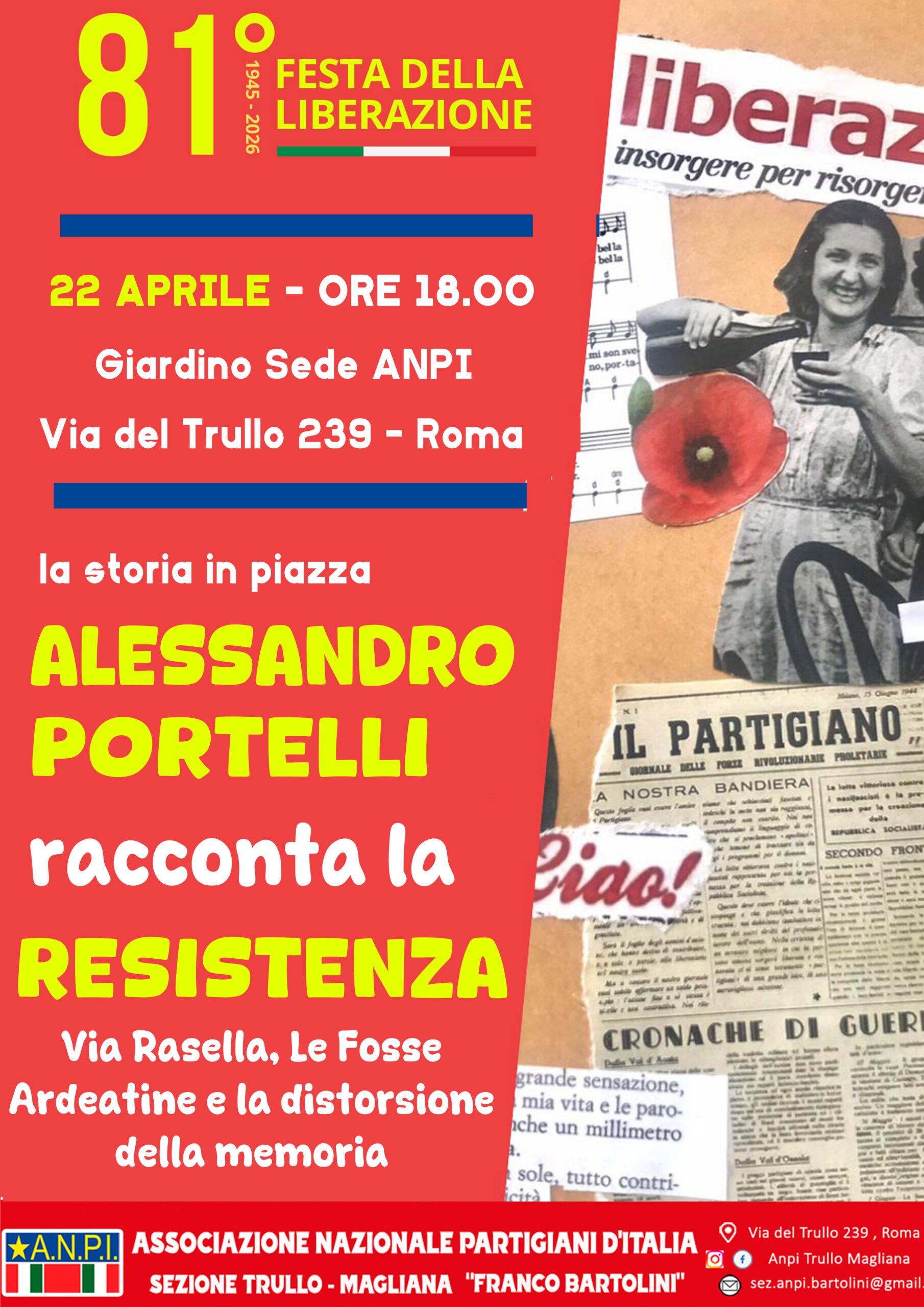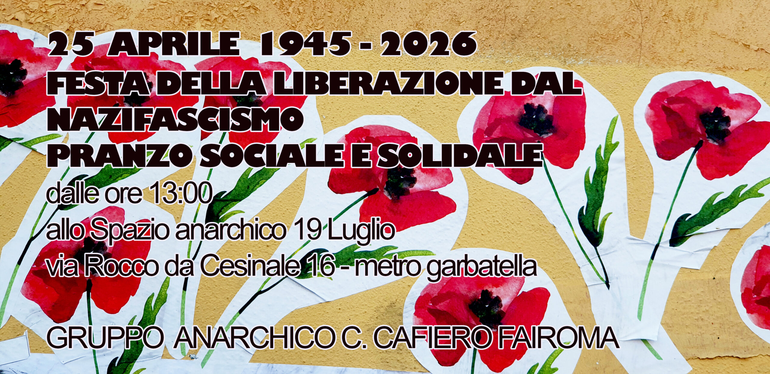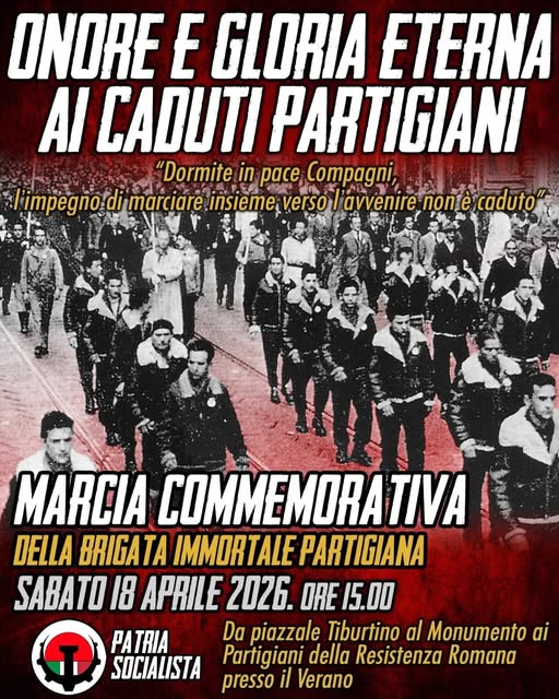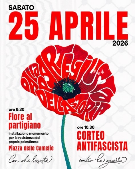 Sabato 25 Aprile 2026 DALLA PARTE GIUSTA DELLA STORIA ore 9:30 – Fiore al PartigianoInstallazione monumento per la resistenza del popolo palestinesePiazza delle Camelie ore 10:30 – CORTEO ANTIFASCISTA e
